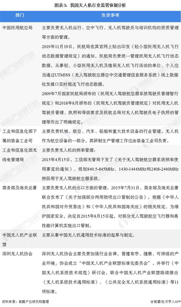 近年来,我国无人机行业进入快速发展阶段,民用无人机更是连续三年保持超过50%的增长率,表现亮眼。基于5G、人工智能、物联网和大数据等的技术力量的变革和下游应用市场需求的持续爆发,更是给行业发展带来巨大的想象力。然而,与行业快速增长相对于的是监管政策的相对落后,无人机未经许可闯入公共及敏感区域、意外坠落、影响客机正常起降、碰撞高层建筑等“黑飞”事件时常发生,给社会正常生产生活秩序与居民人身安全带来一定的威胁,相应的隐私问题也引起了相关关注,种种现象表明,加强无人机监管以引导行业健康有序可持续发展势在必行。目前,我国无人机的研制、销售、使用与出口相关管理部门主要包括中国民用航空局、工业和信息化部、商务部及海关总署、中国无人机产业联盟和深圳无人机协会等。