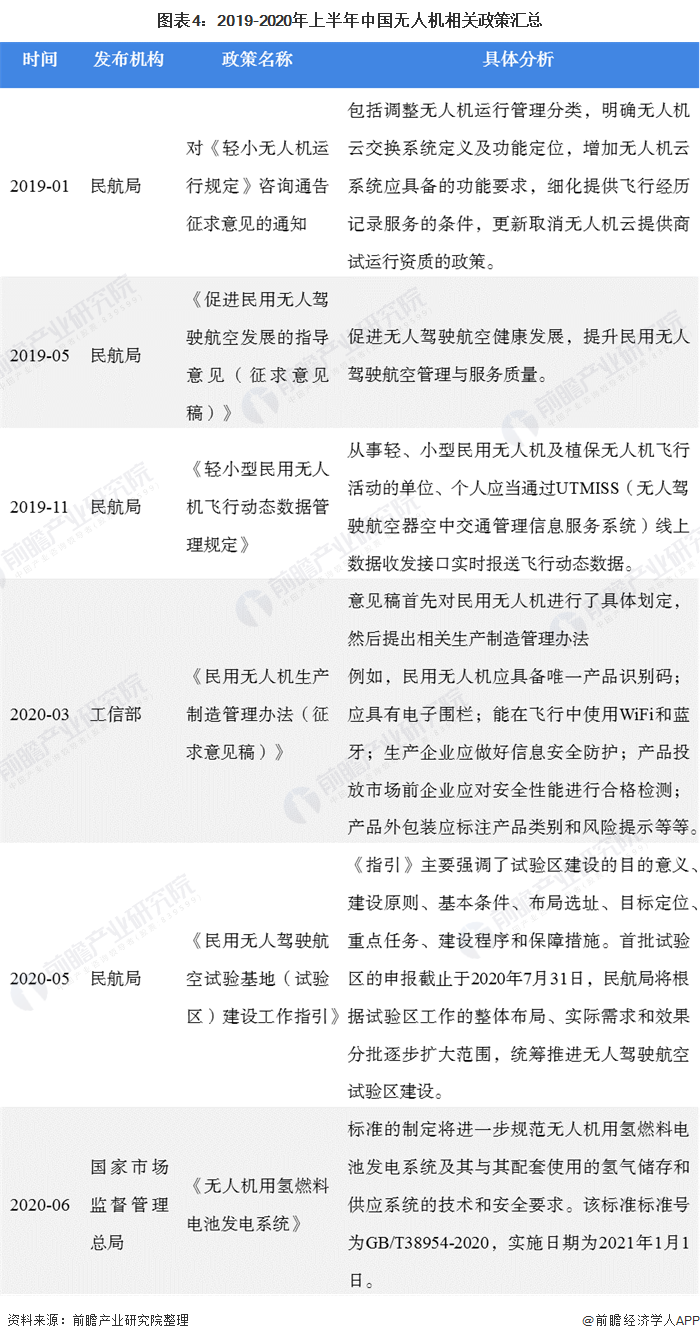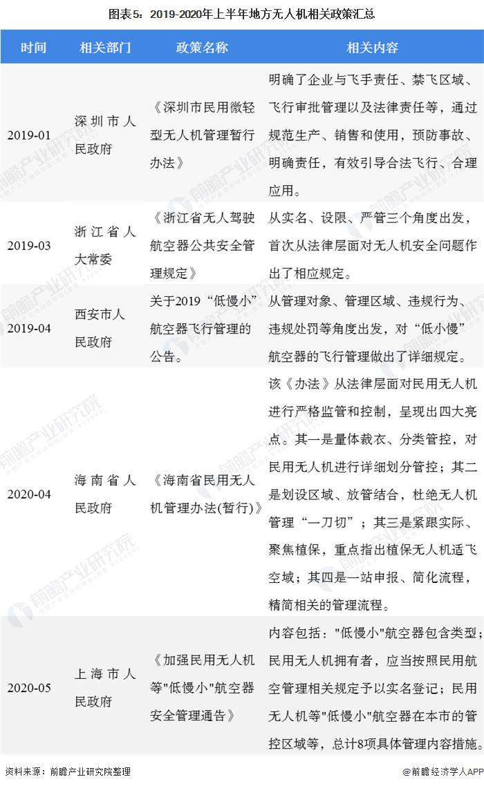 近年来民航局和工信部等部门陆续发布了关于无人机生产制造、驾驶证登记注册和空中飞行管理等的相关政策,如2019年国家民航局飞行标准司修订了咨询通告《轻小无人机运行规定》以进一步规范轻小无人机运行,2020年3月20日,工信部装备二司公开征求对《民用无人机生产制造管理办法(征求意见稿)》的意见,以规范民用无人机生产制造相关活动,维护国家安全、公共安全、飞行安全,促进民用无人机产业健康有序发展。与此同时,无人机行业相关立法工作也取得重大进展。2020年7月,国务院办公厅正式印发《国务院2020年立法工作计划》 明确将《无人驾驶航空器飞行管理暂行条例》的制定纳入国务院2020年立法工作计划。该条例指出,民用无人机制造的行业管理部门由国务院工业主管部门负责,运行和运营管理部门由民用航空主管部门即民航局负责,产品认证与监督由市场监督管理部分负责。在政策监管重点上,2019年的政策重点在于无人机运行和空中飞行方面的管理,2020年政策主要聚焦在无人机的产品和配套设施管理上。这些重大监管政策的出台和相关立法工作的开展完善了无人机行业的运行体制机制,进一步促进了无人机行业的合法化运行,并推动民用无人机行业步入强监管阶段。与国家相关发展战略和监管政策相呼应,各地地方政府和立法部门也积极加紧开展相关监管政策的研究出台和落地实行,督促相关企业合规合法生产经营,确保无人机行业安全、有序、可持续发展,控制好“黑飞”现象蔓延的趋势,加强对无人机行业的监管,推动行业健康良好有序发展。作为“无人机之都”的深圳,在无人机飞行管理方面同样走在前列。2018年,深圳市公布了《深圳地区无人机飞行管理试点工作实施方案》和《深圳地区无人机飞行管理实施办法(暂行)》,并配套推出了无人机综合监管平台,这是我国首个无人机综合监管平台,标志着空地联合、管放结合、多部门协同管理无人机的试点工作进入试运行阶段。2019年1月2日,深圳市人民政府审议通过了《深圳市民用微轻型无人机管理暂行办法》,该办法从生产和销售管理、飞行管理及法律责任三方面出发,明确了企业与飞手责任、禁飞区域、飞行审批管理以及法律责任等,通过规范生产、销售和使用,预防事故、明确责任,有效引导合法飞行、合理应用。浙江、四川和海南等地也发布了无人机管理的相关政策,具体如下表所示: